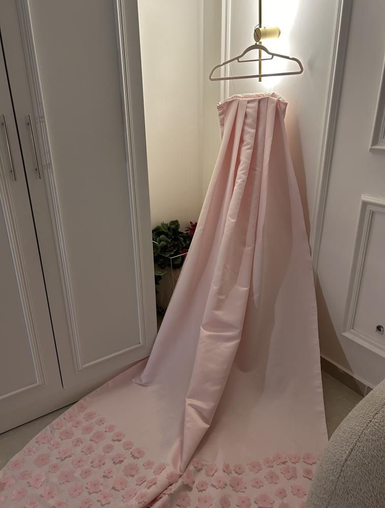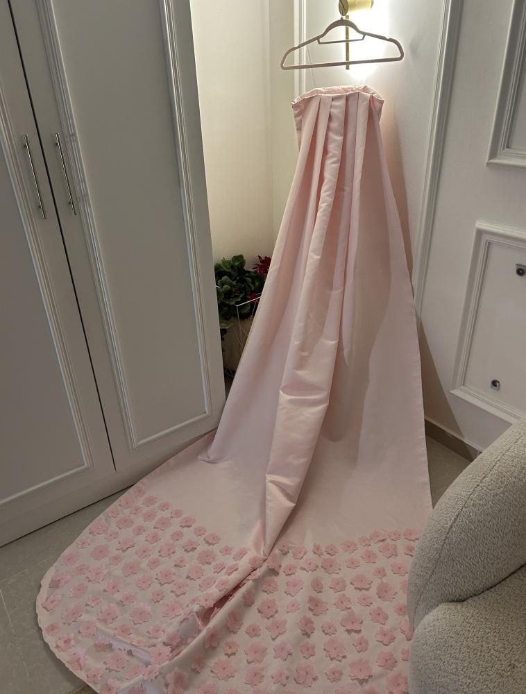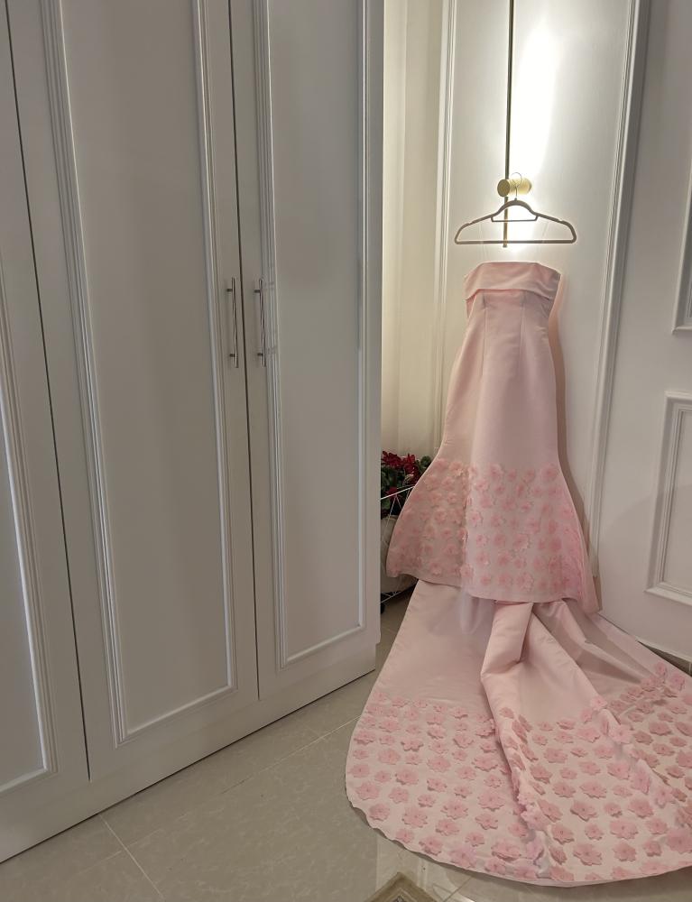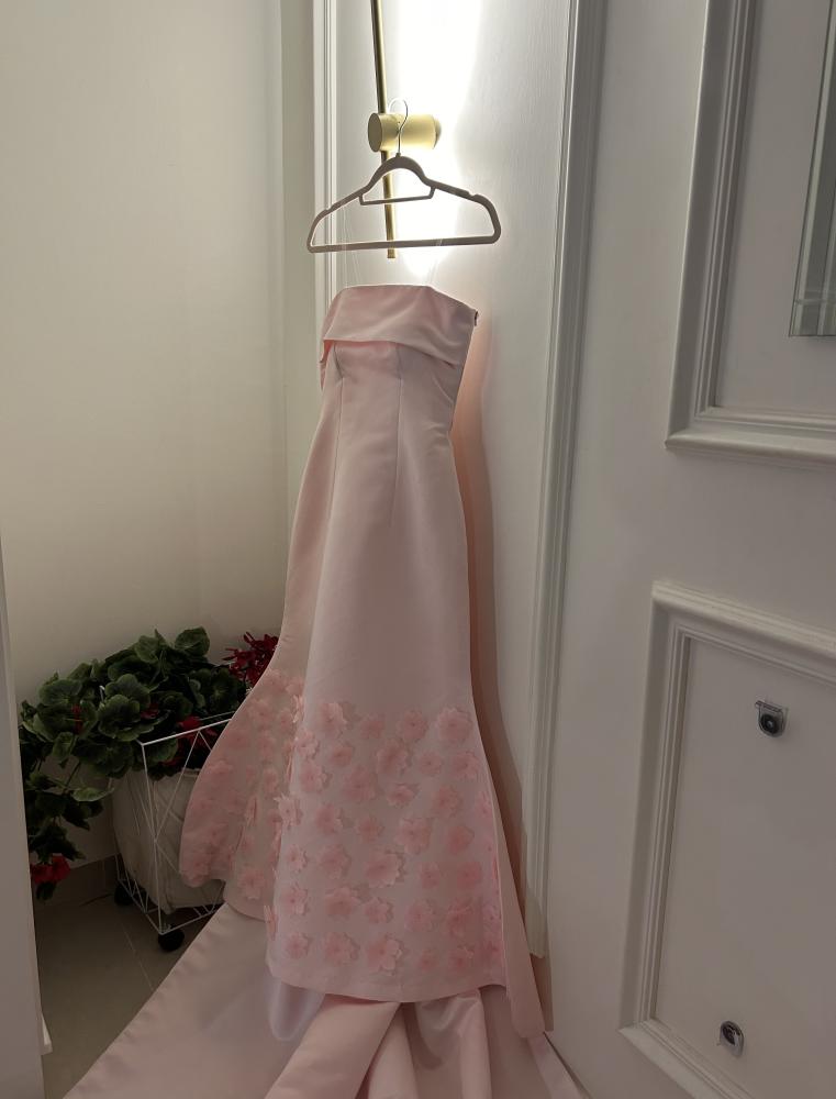 فستان بتصميم يحدد الجسد بطريقة جميلة ومميز باضافة الورد المصنوع والمركب يدويا الى طرف الفستان والذيل وبالاضافة الى قطع خرز مضافة بشكل جميل وانيق وذيل طويل على كامل الفستان لاعطاء فخامة للفستان يساعد التصميم على اخفاء عيوب البطن وابراز الخصر بطريقة رائعة