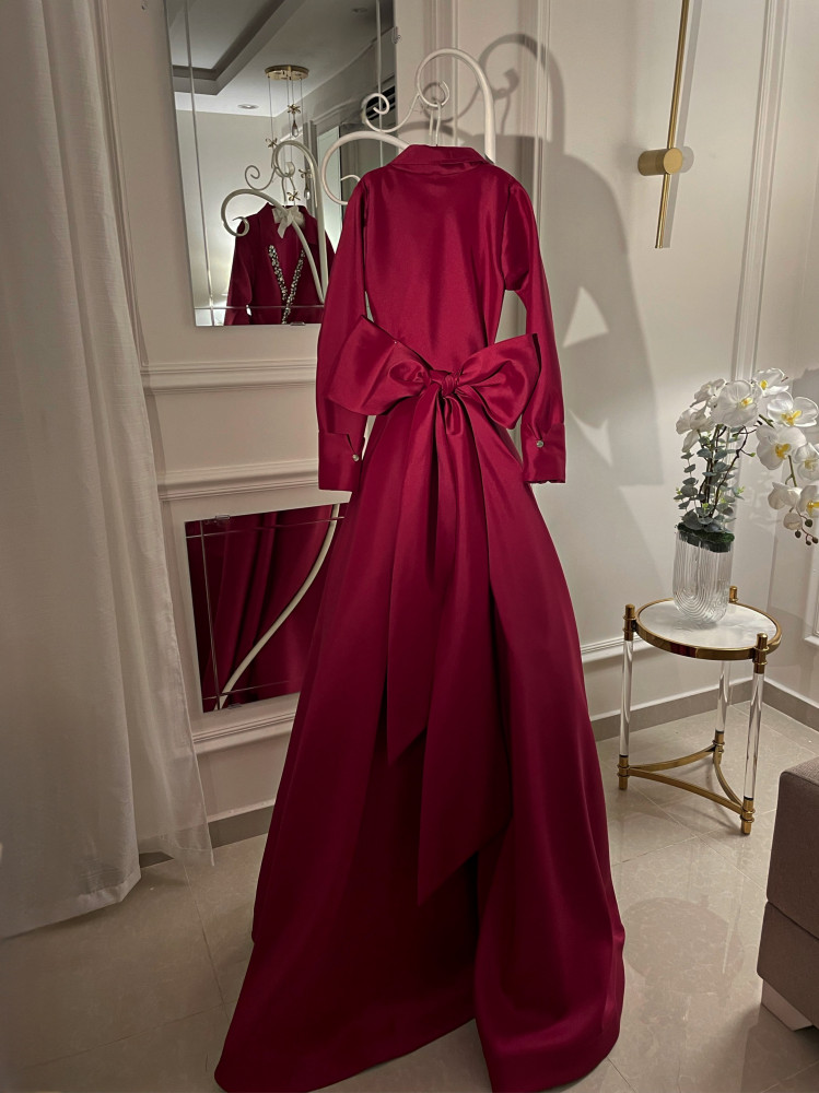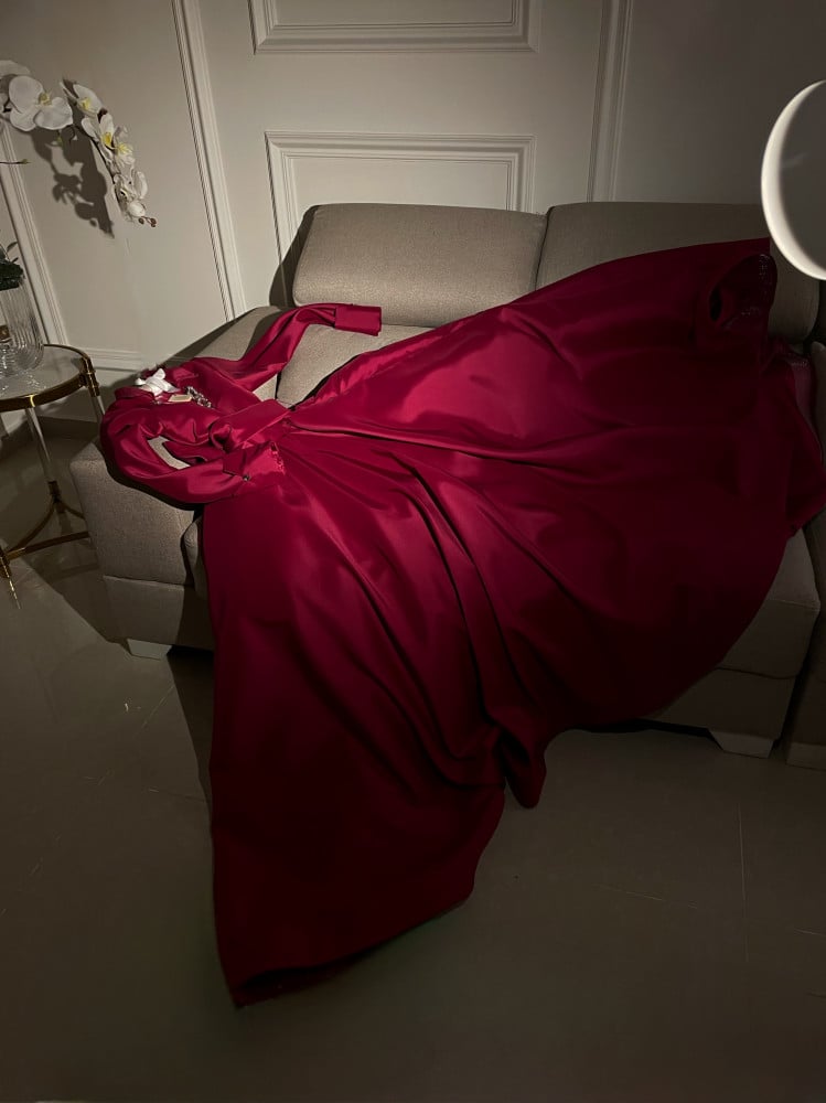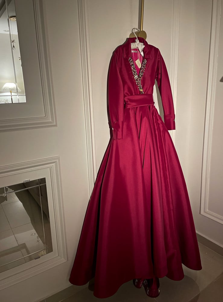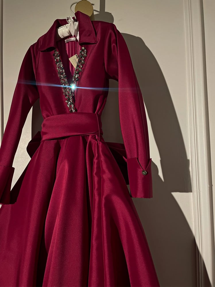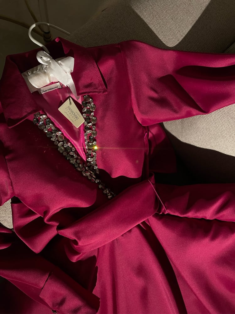 Distinctive ruby color and Swarovski crystal touch on the sleeves